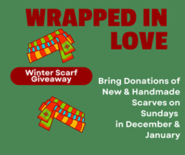Makers Ministry is again collecting handmade and donated (new) scarves for a Wrapped in Love scarf give-away planned for MLK Day. Scarves will be draped on the church fence in a colorful “scarf bombing” display with a Wrapped in Love/ Free Scarves sign. Please look for a donation basket in Fellowship Hall during the months of Dec. and Jan. All are welcome to help us drape the scarves on the fence after church on Sunday Jan. 18th.